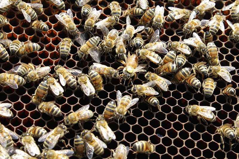 Sur ce cadre, positionné au centre de la ruche on peut observer : des cellules pleines de nectar (liquide brillant), des cellules remplies de pollen (jaune/orangé), des cellules operculées contenant des larves (beiges), des cellules non operculées contenant de jeunes larves (blanches) et… un grand nombre d’ouvrières.